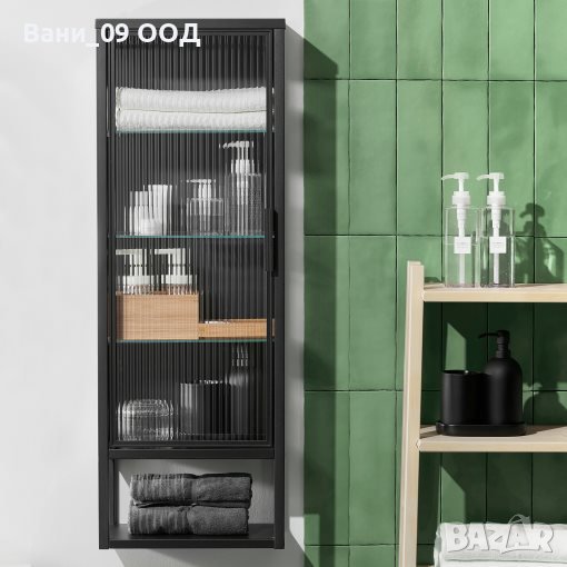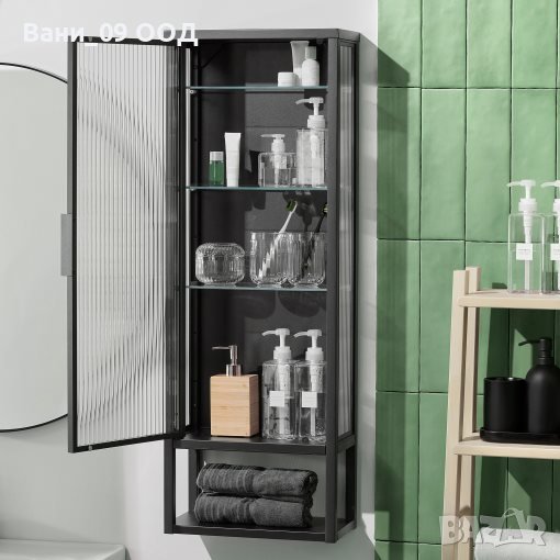 Стилен модел шкаф за баня, изработен от стомана и алуминий, със стъклена врата и 4 рафта зад вратата, както и един открит рафт под вратата, където могат да се поставят кърпи или други принадлежности.