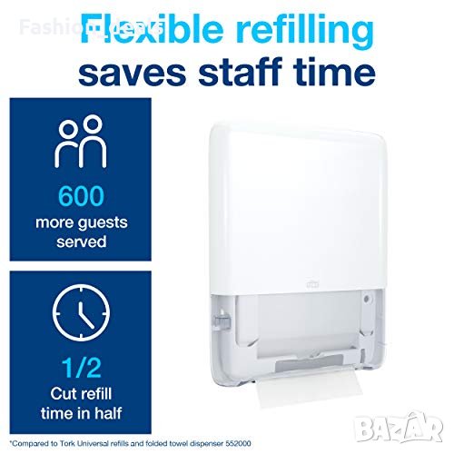 Диспенсърът разполага с гъвкава система за зареждане, която ви позволява да зареждате хартиените кърпи Tork в удобно за вас време. Тази гъвкавост може да помогне за рационализиране на поддръжката и да гарантира, че хартиените кърпи са винаги на разположение.