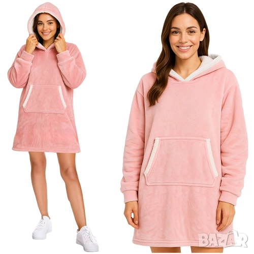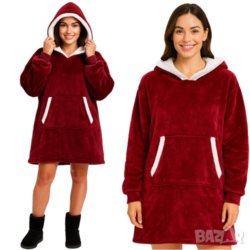Изработено е от висококачествен полиестер с мека вътрешна подплата тип агнешка вълна, която задържа топлината и е изключително приятна на допир. Голямото кенгуру джобче е практично за телефон, дистанционно или просто за стопляне на ръцете.