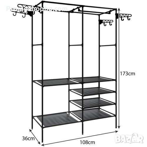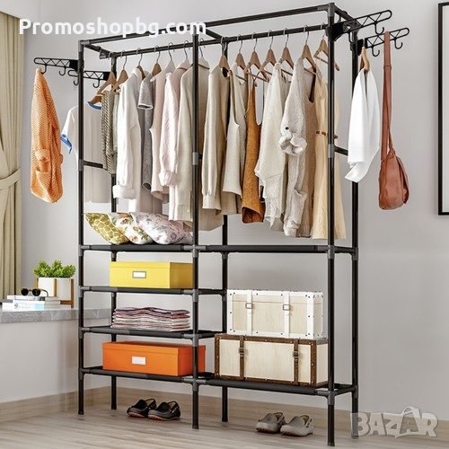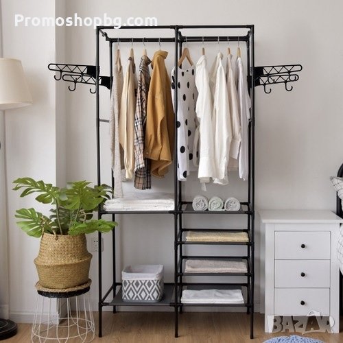 ОПТИМАЛНИ РАЗМЕРИ - закачалката е идеално решение за тези, които имат ограничено пространство, или временна мебел у дома. Закачалката е лека и се адаптира към различни помещения. Разполага с 6 рафта, 2 лоста за окачване и 8 закачалки.