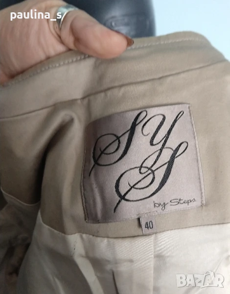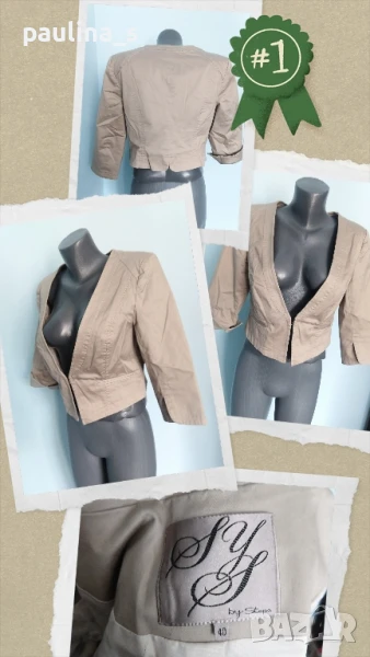 2️⃣. Колаж / M / XL - Уникален марков дънков топ / сако "SYS" by Steps. Цената е крайна 17,5 евро. Уникално дънково сако или топ с шпиц деколте, джобове с филетки и шармантни ръкави. Отзад е просто прелест. Платът е плътен и еластичен, покрива няколко размера. Цветът е Шам фастък, неутрален и подхожда на всичко. Ново е, без етикет, една бройка е, става за посочените размери.