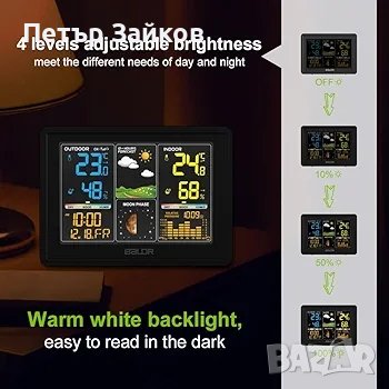 Ясен и четлив екран: Цветният LCD екран включва големи цифри, текст и изображения, които ви позволяват лесно да се информирате за времето по всяко време на деня; Цветните графики ще ви покажат слънчево небе или дъждовен ден, където се намираме, а динамична барометрична хистограма показва промяната в барометричното налягане през последните 12 часа.