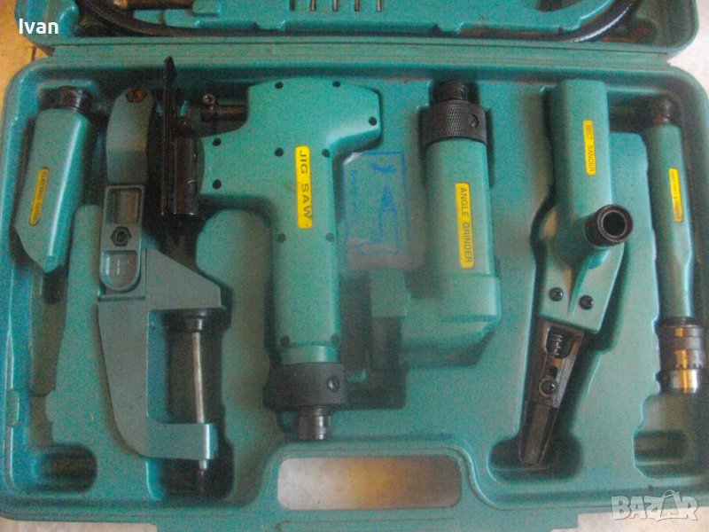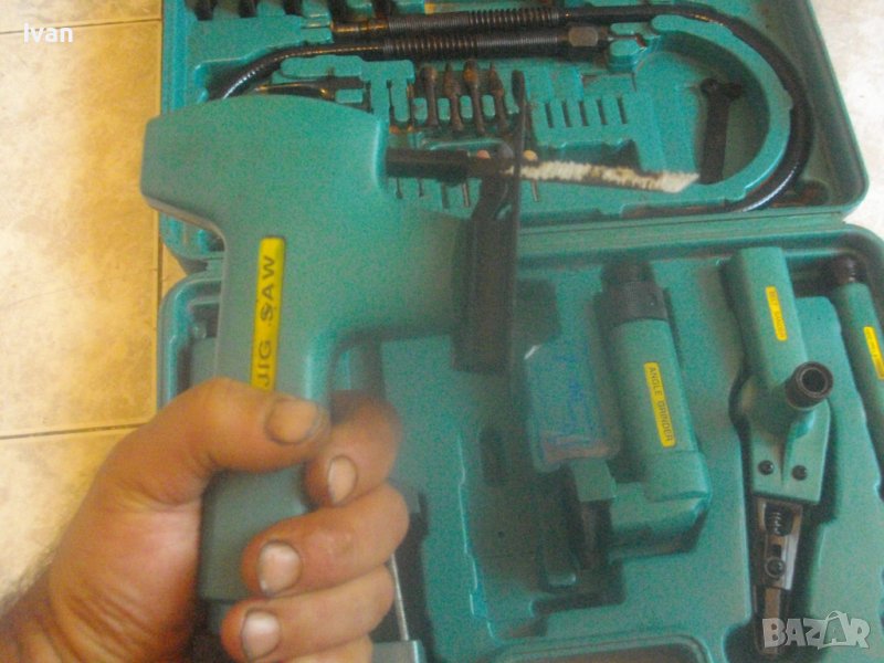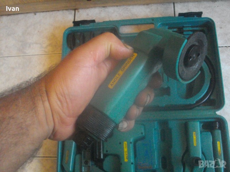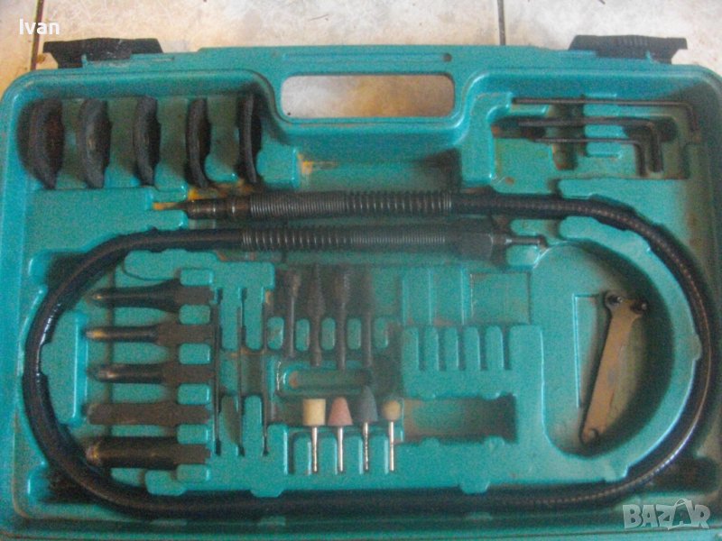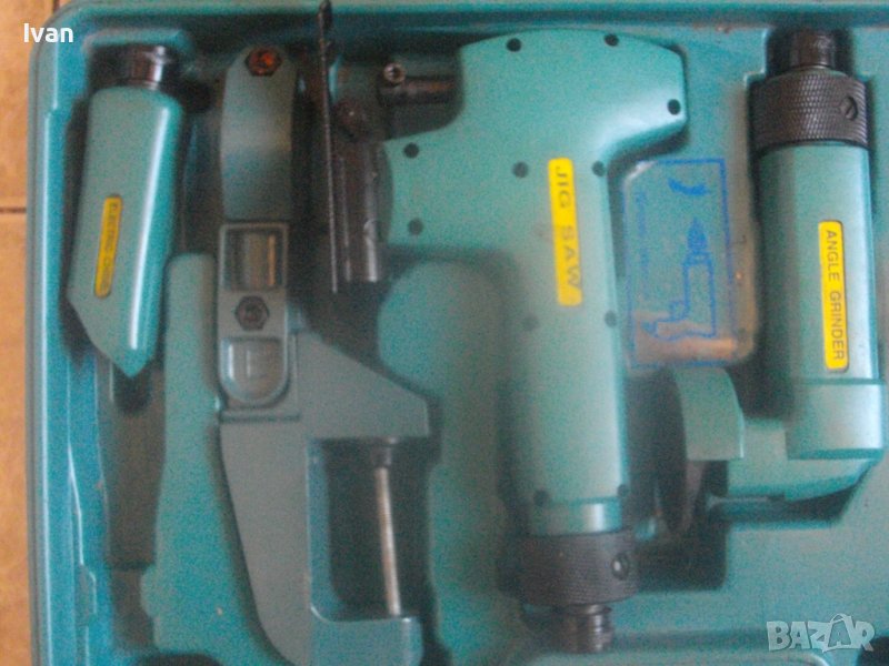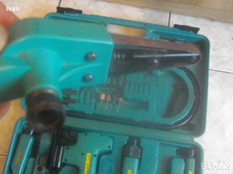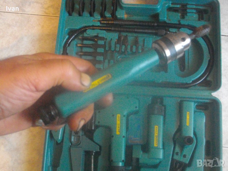 Ползвани, в добро техническо/работно състояние и запазен външен вид. Липсват маркировки за производство, машините имат стикери за вида машина на енгл.език: Jig Saw, Angle Grinder. Belt Sander, Hand Drill Grinder, стойка с чупещ тип глава за постаавяне на някои от машините. Има и шеста машина, която е със счупен наполовина корпус, като тя може да се ползва за резервни части по захвата на другите. В работещо изрядно състояние са 5-те машини: Стойка, Зеге прободен трион, оглошлайф за рязане и шлайфане с поставен шлифовъчен заглаждащ диск малък ф 50 мм, мини лентов шлайф за шлайфане в трднодостъпни места с поставена шкркова лента ширина 10 мм, ръчна пневматична права бормашина с метален патронник за ключ с захват 1,5-10 мм. Маркировко по потронника - SAN. В комплекта от другата страна на куфара има аксесоари: нови 5 бр. шлифовъчни дискове ф 50 мм за ъглошллайфа, 3 бр ключове шстограми, гъвкав вал/гъвкаво рамо, 5 бр. широки и големи длета за дърворезба и стъргане/стружуване на различни повърхности, 3 бр. ножчета за зегето, ключ гаечен, 4 бр. фрезери различни от волфрамов карбид за меки и твърди метали, 4 бр. борчета шлифовъчни различни. Комплектът е прибран в оригиналния си твърд пластмасов куфар съъс здрави и масивни плъзгащи се копчалки и вградени вложки за местата на компонентите. Цената от 559 лв (285.81 €) е крайна и твърда за всичко в комплекта и няма да снема от нея. Тегло на комплекта - 4,0 кг.