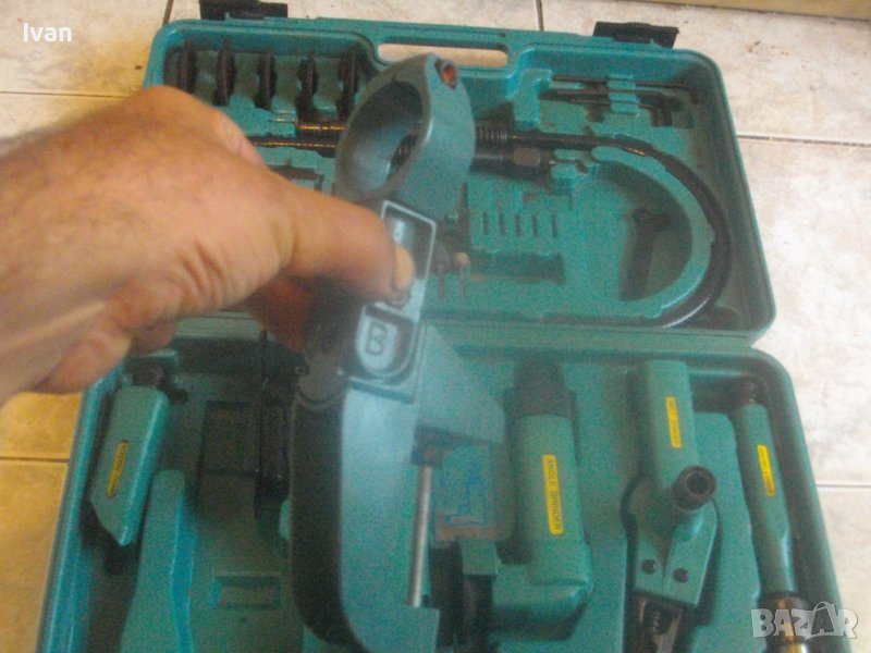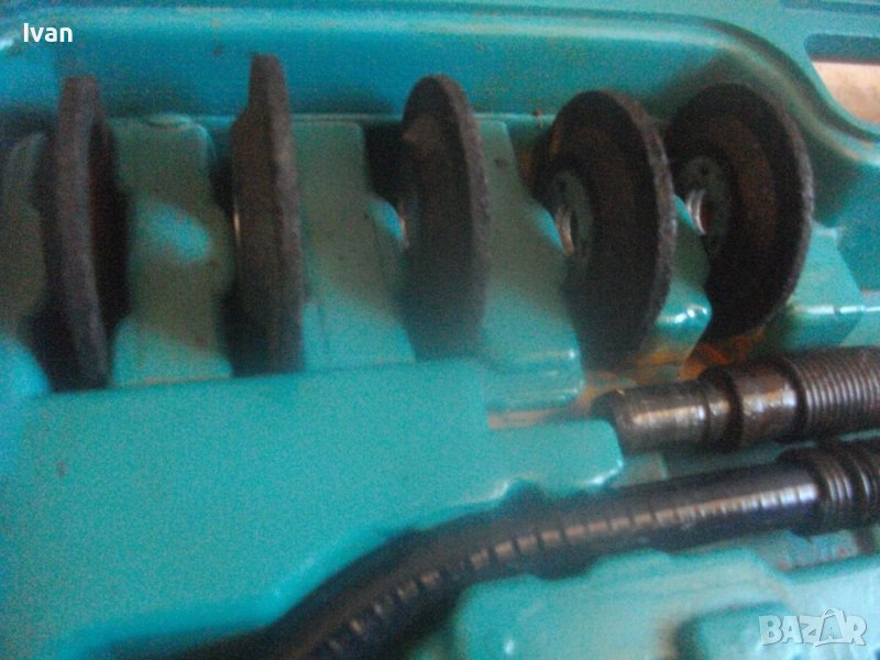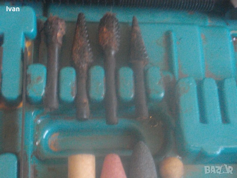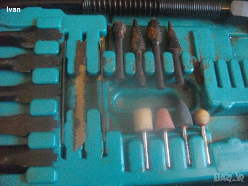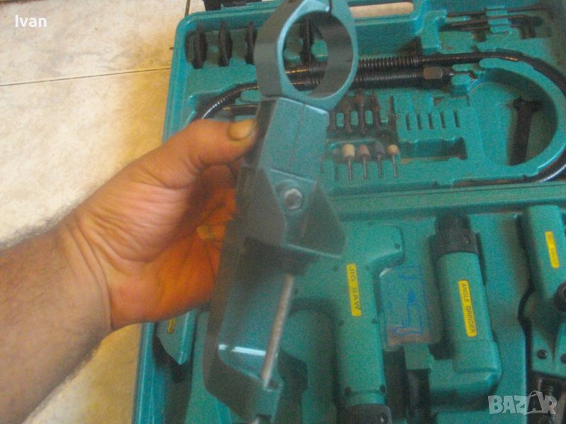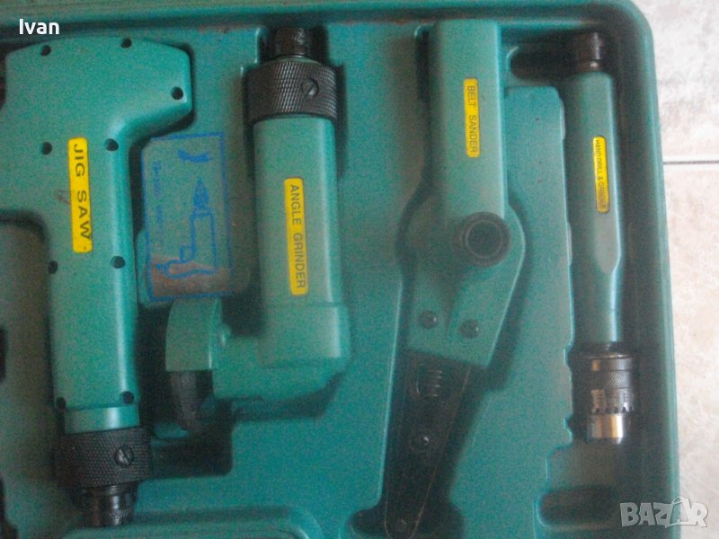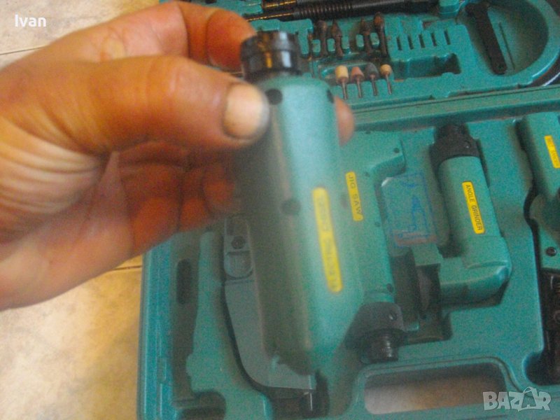 Ползвани, в добро техническо/работно състояние и запазен външен вид. Липсват маркировки за производство, машините имат стикери за вида машина на енгл.език: Jig Saw, Angle Grinder. Belt Sander, Hand Drill Grinder, стойка с чупещ тип глава за постаавяне на някои от машините. Има и шеста машина, която е със счупен наполовина корпус, като тя може да се ползва за резервни части по захвата на другите. В работещо изрядно състояние са 5-те машини: Стойка, Зеге прободен трион, оглошлайф за рязане и шлайфане с поставен шлифовъчен заглаждащ диск малък ф 50 мм, мини лентов шлайф за шлайфане в трднодостъпни места с поставена шкркова лента ширина 10 мм, ръчна пневматична права бормашина с метален патронник за ключ с захват 1,5-10 мм. Маркировко по потронника - SAN. В комплекта от другата страна на куфара има аксесоари: нови 5 бр. шлифовъчни дискове ф 50 мм за ъглошллайфа, 3 бр ключове шстограми, гъвкав вал/гъвкаво рамо, 5 бр. широки и големи длета за дърворезба и стъргане/стружуване на различни повърхности, 3 бр. ножчета за зегето, ключ гаечен, 4 бр. фрезери различни от волфрамов карбид за меки и твърди метали, 4 бр. борчета шлифовъчни различни. Комплектът е прибран в оригиналния си твърд пластмасов куфар съъс здрави и масивни плъзгащи се копчалки и вградени вложки за местата на компонентите. Цената от 559 лв (285.81 €) е крайна и твърда за всичко в комплекта и няма да снема от нея. Тегло на комплекта - 4,0 кг.