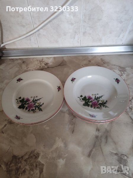 4 бр.дълбоки чинии + 3 бр.плитки, с красив декор, размер - 23 см, маркирани Китка, без забележки. Изпращам по Еконт с 10% отстъпка от транспортната доставка.