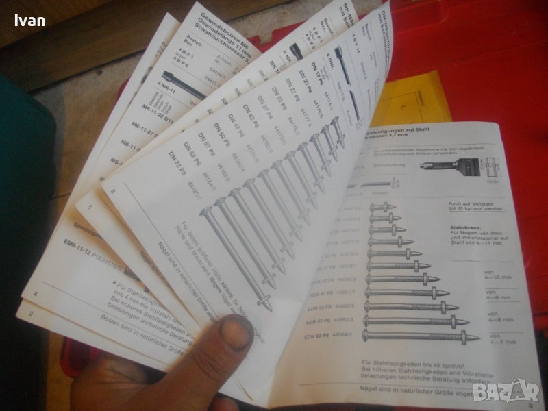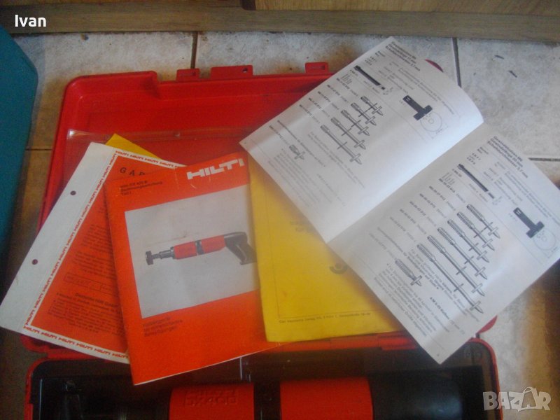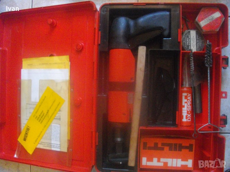 ОПИСАНИЕ на HILTI DX 400 B. Цена 449 лв. Почти нов пистолет за бърз диреектен монтаж в бетон и метални конструкции, доказал се във времето ефетивен модел на Хилти. Оригинално немско произовдство 1976 г - Deutschland HILTI GmbH. Машината е с много запазен външне вид, без надрасквания по боята. В отлично техническо8работно състояние. Пробвана, беез забележки. Оригинален пластмасов куфар на модела с размери 400 х300 х 80 мм, без никикави забележки, оригиналната боя по надписа на модела на машината върху куфара стой, няма никакви пропуквания или липси по копчалките. В комплекта са включени оригиналите на модела машина /в пълна изправност/, дълга четка метална и 32 метални шомпола за почистване на цевта. няколко оригинални книжки и докменти на машината с поместени сники, технически данни и характеристики на ползавните капси заряд и пирони. 2 бр. резервни бутала, очила предпазни, спрей на Хилти, 5 резервни ролкови водачи за цевта, 10 бр. стоманени пирони различни дължини, 1 кутия с черни капси заряд калибър 6,8/11 - 30 бр, 1 кутия червени капси - калибър 6,8/11 - 20 бройки. Модела Хилти има съвместимост за пирони с моделите DX 100L, DX 400 B, DX 450. Капсите имат съвместимост с модели DX 300 и DX 450. Тегло на комплекта - 6,5 кг.
