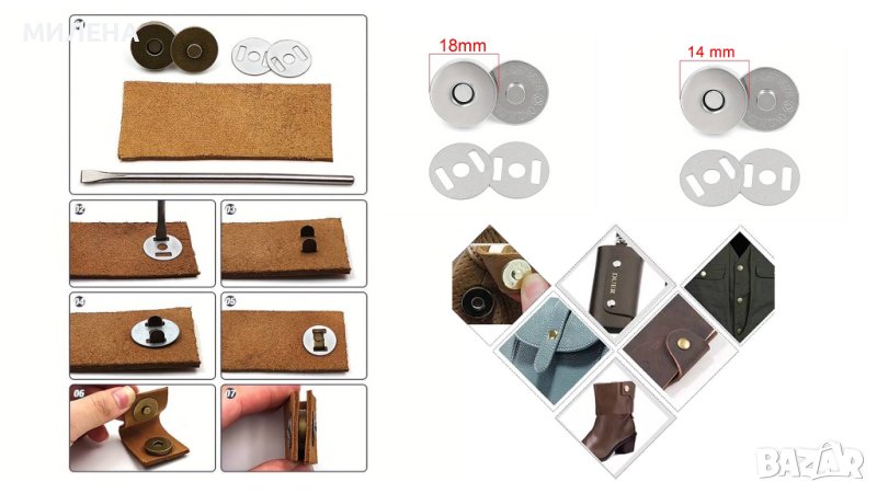 Двете части на закопчалката лесно се закрепват една срещу друга върху кожа или плат. Закопчалката е снабдена с неодимов магнит, който е малък, но силен, затова надеждно държи чантата затворена.