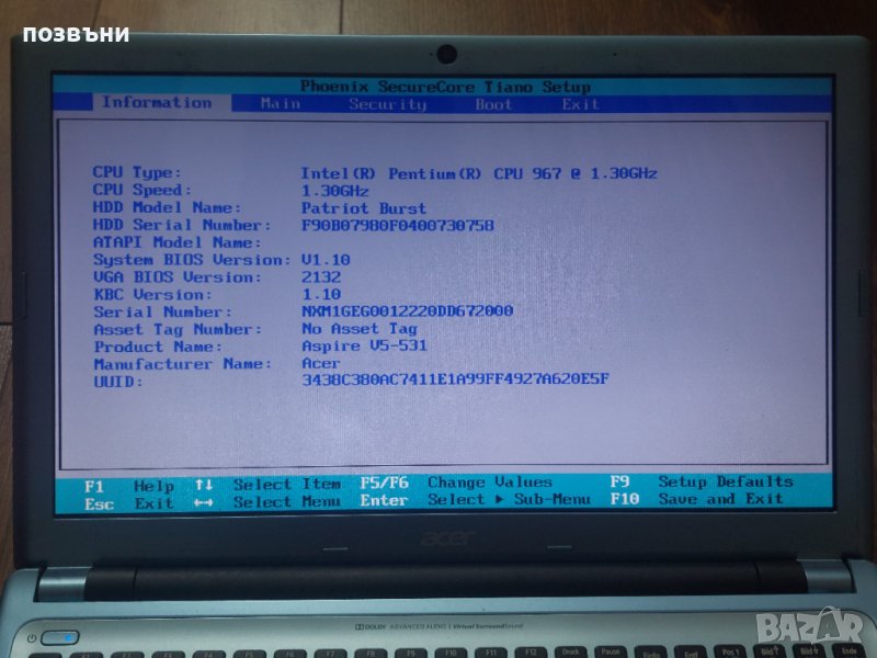 Лаптоп Acer Aspire V5-531 работещ на части Pentium 967