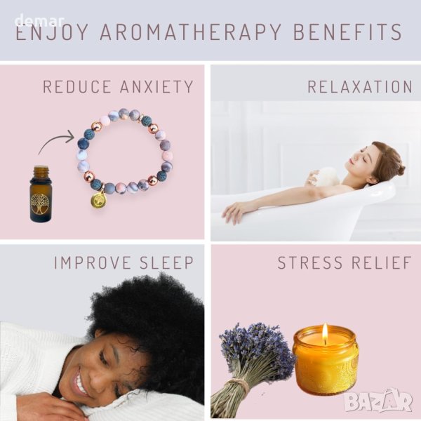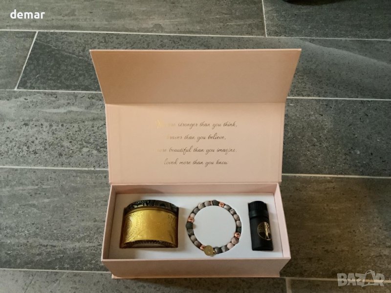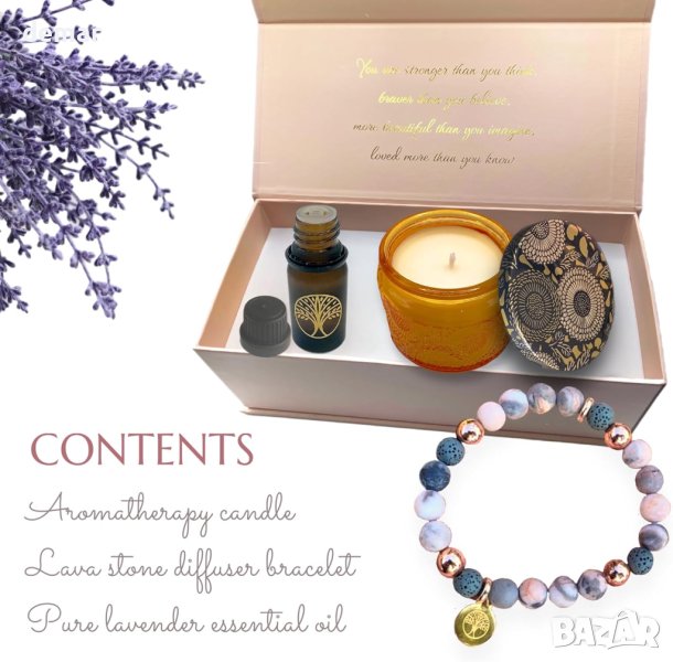 Зарадвайте специалната жена в живота си с нашия луксозен подаръчен комплект за ароматерапия, идеален за придаване на мир и спокойствие. Състои се от ръчно изработена дифузерна гривна, изработена от естествени камъни и свещ от соев восък от 100% чисто етерично масло от лавандула, тя може да се потопи в подмладяващата сила на ароматерапията, където и да отиде. Просто добавете няколко капки етерично масло от лавандула към порестите камъни от лава за успокояващ аромат. Представен в разкошна магнитна подаръчна кутия, украсена със златисто фолио, отварянето й разкрива вдъхновяващо послание, което й напомня за нейната сила и красота. Ароматерапията, със своята богата 6000-годишна история, предлага холистични ползи, от намаляване на тревожността до облекчаване на менструалния дискомфорт. Наред с терапевтичните свойства на етеричните масла, чакра камъните на гривната канализират положителна енергия, насърчавайки сила и смелост. Този подарък, универсален в своята привлекателност, е идеален за всеки повод - рождени дни, годишнини, важни събития или просто така. Подарете й уникален подарък, който резонира с любов, внимателност и благополучие.