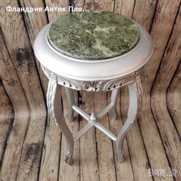 Тази висока помощна маса е истински произведение на изкуството и е вдъхновена от епохата на Луи XVI, която се слави с изяществото, разкоша и изискаността. Тя съчетава изисканите детайли на стила с впечатляваща комбинация от сребриста дървена част и мраморен плот в нюанси на зелено.