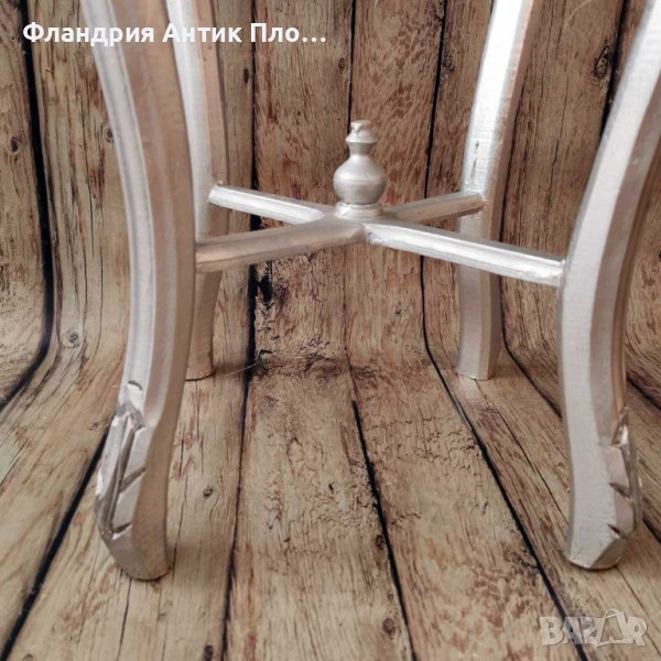 Дървената част на масата е изработена с изключителна изящност и внимание към детайлите. Фините орнаменти и извити линии създават усещане за движение и грация, характерни за стила Луи XVI. Сребристият цвят придава на масата бляскав и разкошен вид, който е типичен за кралския френски стил.
