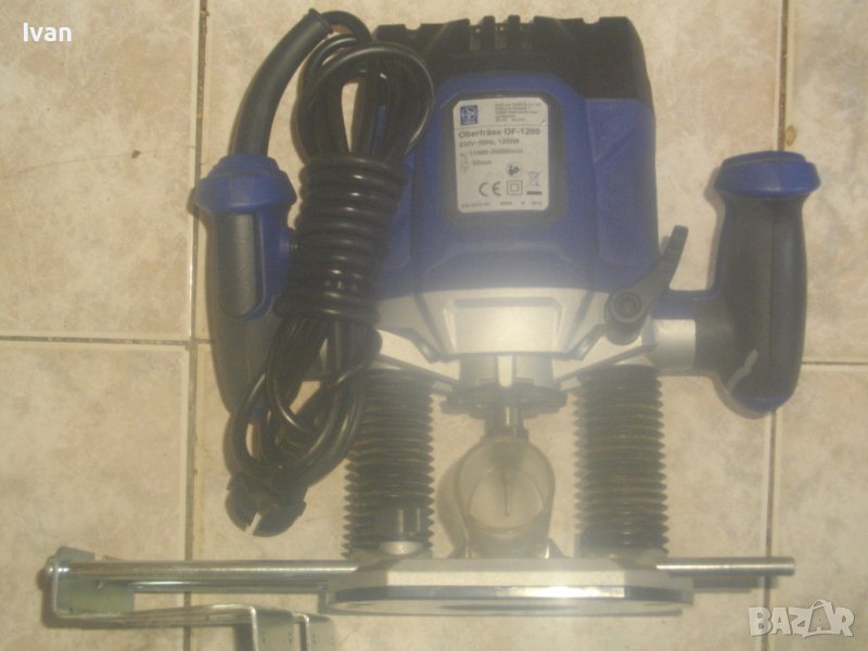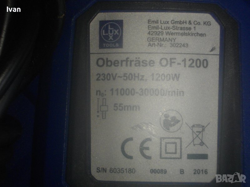 ОПИСАНИЕ на оберфреза 1200 вата. Немска оригинална 2016 г. Марка и модел - LUX OF - 1200. Germany. Почти нова, като нова, трудно различима от нова. В отлично визуално и работно/техническо състояние. Без никакви забележки. Без искрене, без смущаващи вътрешни шумове. Работен хоод 55 мм. Мощност мотор 1200 вата, скорост 11000-30000 об/мин. Произовдител - Emill LUX GmbH Germany. Цанга поставена 6 мм, гайка оригинална, поставен нов специализиран немски фрезер. Наличие на оригиналиня водач на долнота основа на машината и конектора за скачване с маркуч на строителна прахосмукачка. 6 степени на регулация на скоростта. Тегло на машината и водача - 4,5 кг.