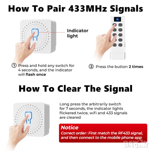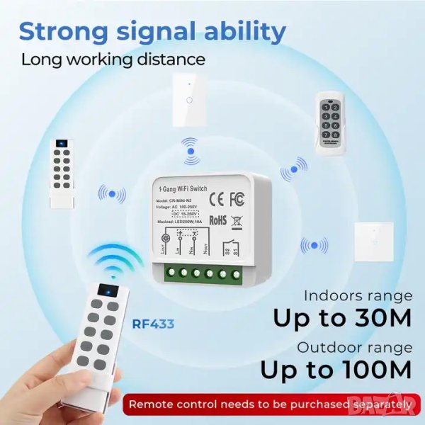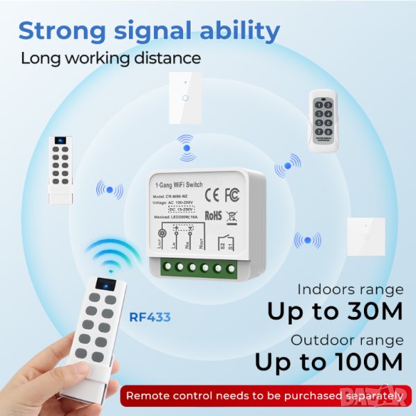 --【Wifi+433】Може да се управлява от приложението Tuya, гласов високоговорител, безжичен превключвател и дистанционно управление, което е по-удобно. Ако домашната мрежа е прекъсната, дистанционното управление също може да управлява устройството.