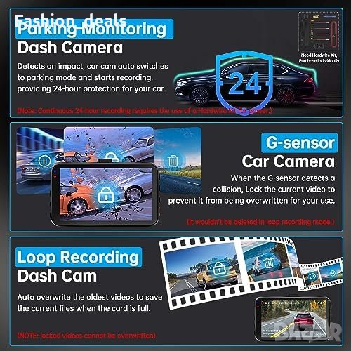 2,5K предна камера за автомобил и 1080P задна камера за автомобил с 64GB SD карта (поддържа до 256GB) за ясно качество на видеото.