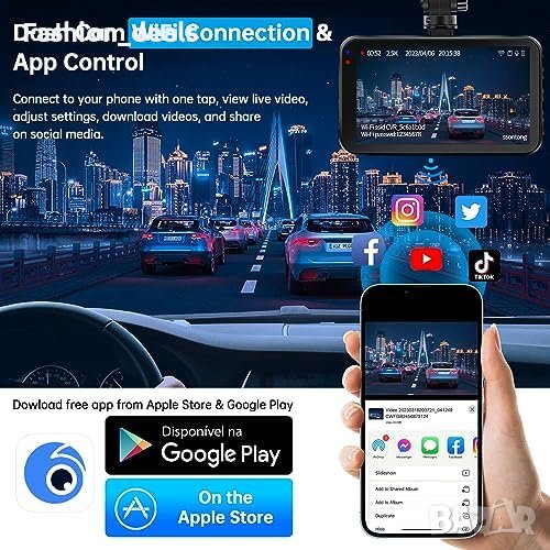 Вграден Wi-Fi и управление чрез приложението "Viidure" за преглед, възпроизвеждане и управление на автомобилната камера.
