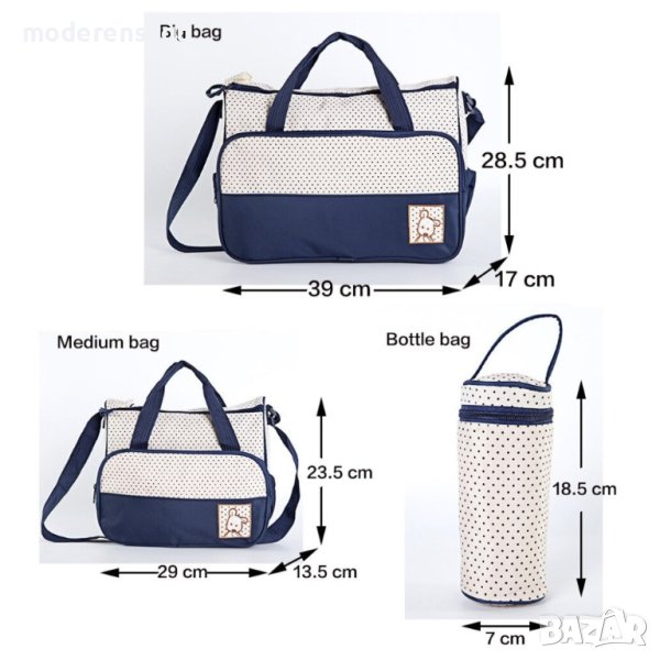 В комплекта ще намерите голяма чанта, малка чанта, несесер, термо опаковка за шише и подложка за смяна на пелени. Всяка от двете чантите е оборудвана с дълга регулираща се дръжка удобна за носене на рамо или пък за поставяна на бебешката количка. Също така чантите разполагат с по 2 бр. къси дръжки за носене в ръка. И двете чанти разполага с вътрешни и външни джобове в които ще подреждате всички необходими аксесоари за ежедневната разходка навън.