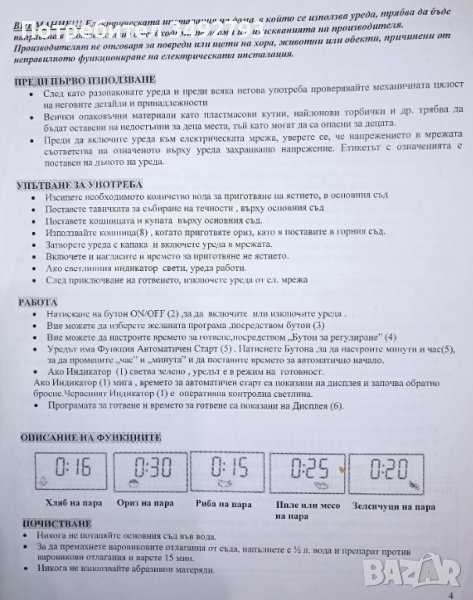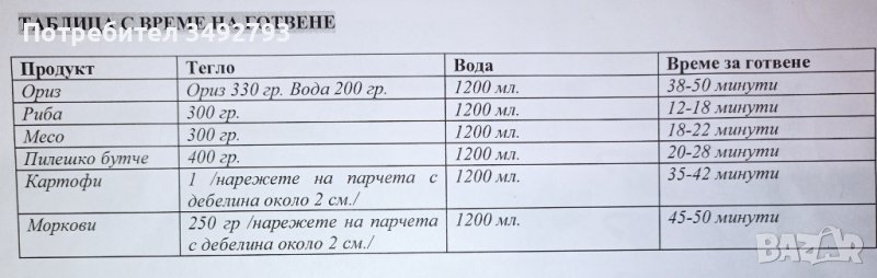 Прилагам пълното описание с указания за ползване и таблица за време за готвене на различните продукти. Цветните снимки са ориентировъчни