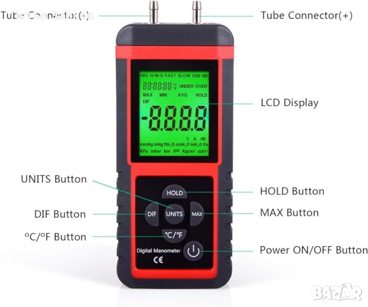 12 избираеми мерни единици (kPa, Psi, Kgfcm2, Ozin2, Bar, mbar, inHg, mmHg, InH2O, FtH2O, cmH2O, Pa) с функция: Задържане на данни и код за грешка - Време за реакция: 0,5 сек.