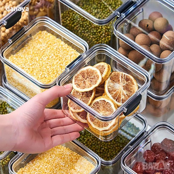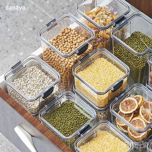Квадратна кутия с плътно затварящ се капак, предназначена за съхранение на всякакви хранителни продукти. Може да се използва и като кутия за храна, като кутия за подравки, за съхранение на вече отворени пакети с продукти и т.н.