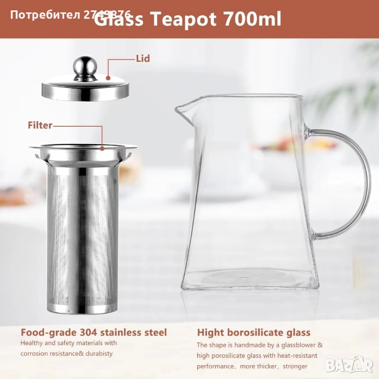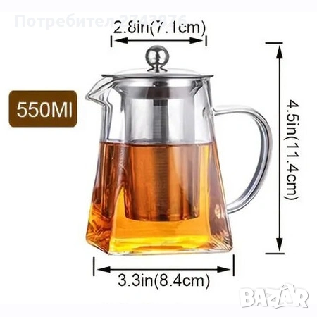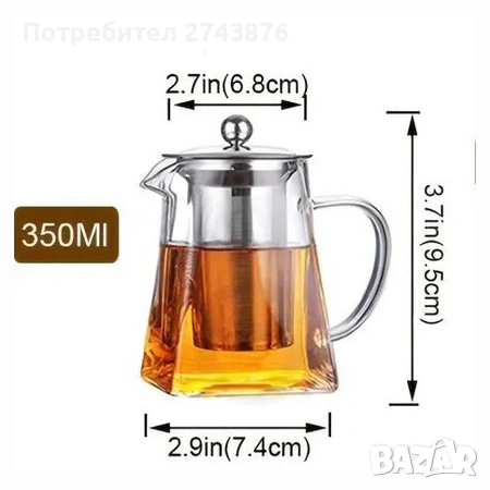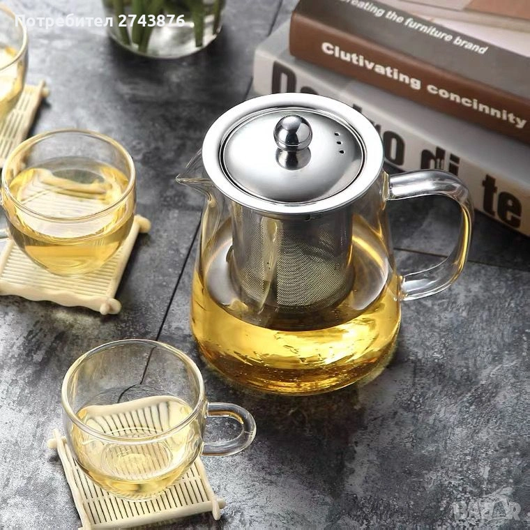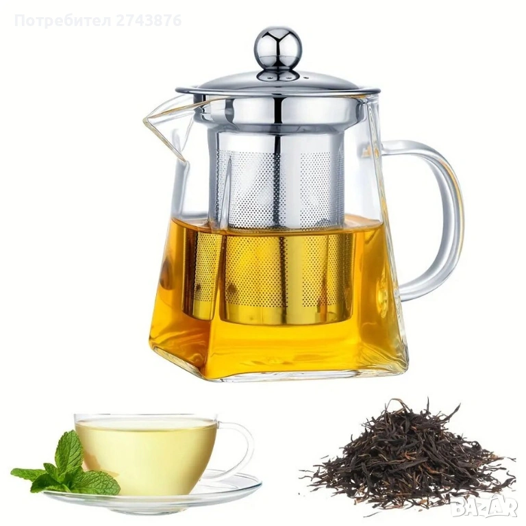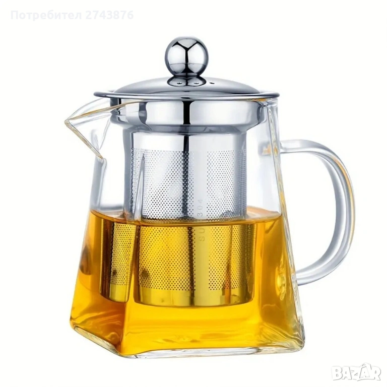 Стъклена кана за чай, квадратна,750 мл,с цедка от неръждаема стомана , Боросиликатно стъкло → Обява 42469669
