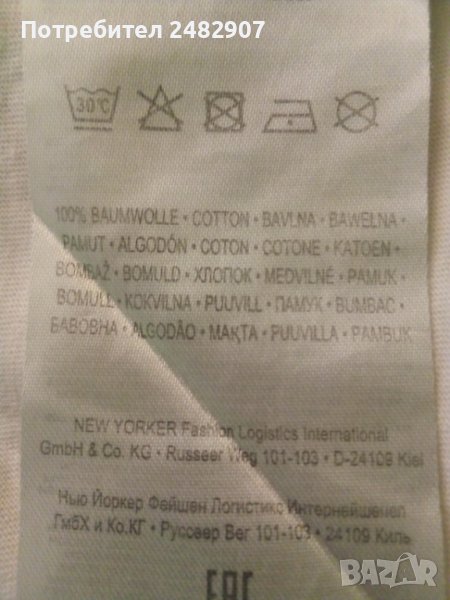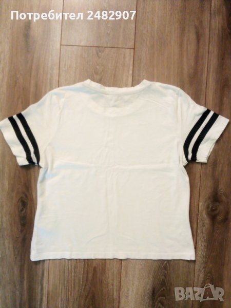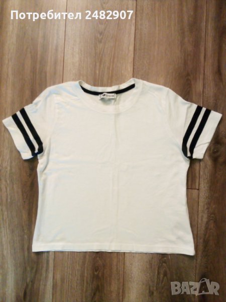 Къса дамска тениска в бяло, размер XS. Съдържа 100 % памук. Ширина в раменете - 34 см, ширина под мишниците и в долната част - 45 см, дължина от рамото до долу - 48 см, дължина на ръкава от рамото - 17 см, ширина на ръкава в долната част - 14 см. Запазена, с нормални следи от износване.