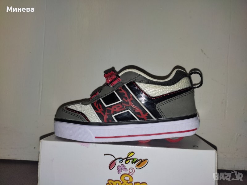 Светещи маратонки с колелца HEELYS, в комбинация от сиво, бяло и червено, изработени от кожа и текстил, с по две колелца на обувка за повече стабилност при каране и голямо светещо лого отстрани. Номер 31 и дължина на стелката 18 см.