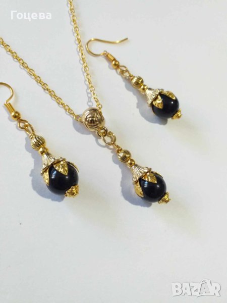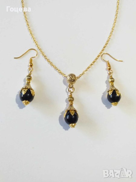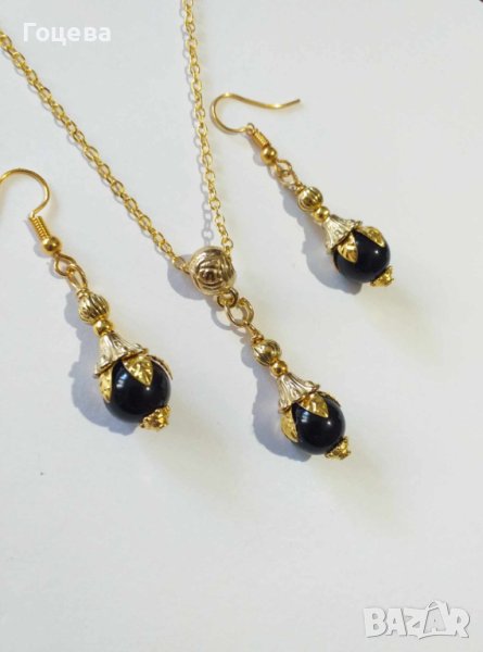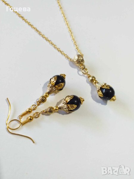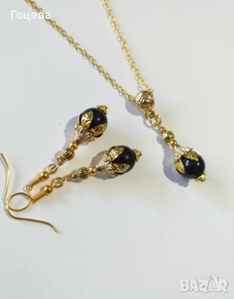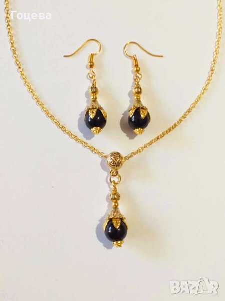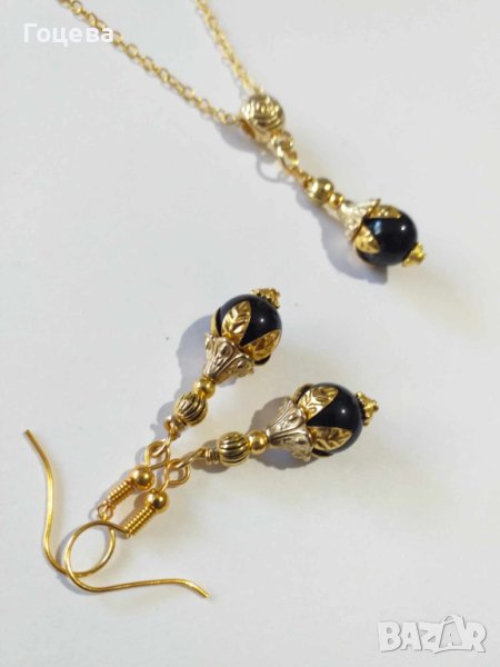 Прекрасно колие и обеци с Черен диамант съчетан с флорални орнаменти в цвят Антично злато