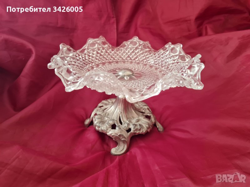 Продавам старинна жардиниера /фруктиера/. Направена е в стил Рококо. Размери: височина - 15 см., диаметър на стъклената плафониера - 24 см. Стъклото е в перфектно състояние. По металната част има леки следи от времето, но като цяло е доста запазена. Няма счупено или лепено. Цената може да се коментира в рамките на разумното.