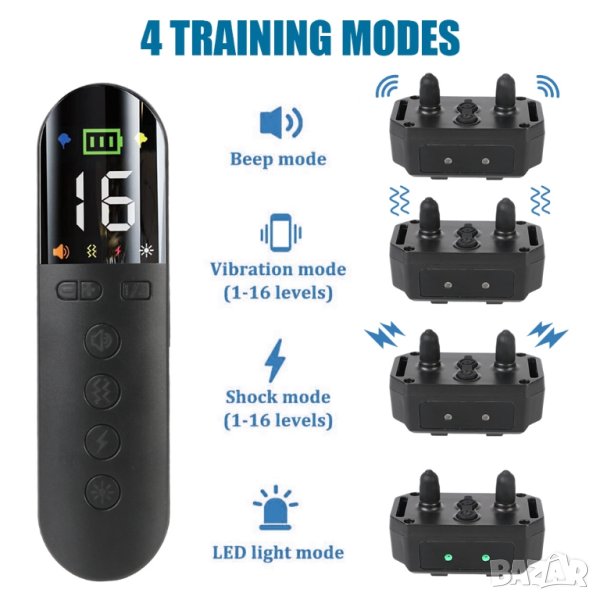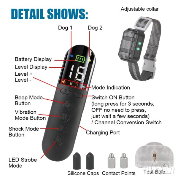 Спецификации: Тип: Нашийник за обучение на кучета Размер като на снимката Цвят черен Материал: пластмаса Ниво на водоустойчивост: IP6.8 Метод на зареждане: USB зареждане Напрежение: DC 5V Характеристика: 4 безвредни функции: режим на звуков сигнал, режим на вибрация, режим на удар и режим на LED индикация. 16 нива на мощност, можете да регулирате силата за различни видове кучета. Нивата от ранг 1 до 16 са налични както с режим на вибрация, така и с режим на удар, които се използват по-често по време на курс за обучение на кучета. IP68 водоустойчив приемник, може да се използва и когато домашни любимци плуват, гонят играчки около басейна или играят под дъжда. Електрическото дистанционно управление има функции с двоен канал, за да поддържа обучението на 2 кучета едновременно и да помага на кучетата да учат ефективно и бързо. Безжично управление за дистанционен обхват работи особено добре там, където има препятствия. Дължината на нашийника може да се регулира за кучета с различен размер. Пакетът включва: 1 x Дистанционно управление 1 х приемник 1 x яка 1 х ремък 1 x Micro USB кабел за зареждане 1 X 3,5 мм жак USB кабел за зареждане 1 x Тестова лампа 1 x Чифт къси контактни точки с капачки 1 x Чифт дълги контактни точки с капачки