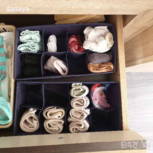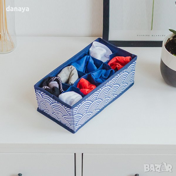 Малка сгъваема кутия за съхранение на чорапи, бельо, шалове и други дребни аксесоари. Текстилен органайзер за гардероб, чекмедже, шкаф, органайзер за под леглото. Органайзерът е сгъваем и лесно преносим, което го прави подходящ и за пътуване. 8 отделения. Предлага се в два десена.