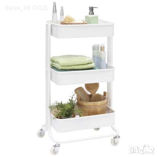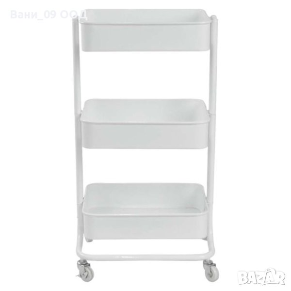 Универсална количка с размери Ш:43/Д:35/В:78.5 см. Тази количка бързо ще се превърне в полезен помощник в ежедневието със своите три дълбоки метални рафта и четири колелца въртящи се на 360° за лесно позициониране. Моделът е подходящ, както за съхранение и пренасяне на кухненски прибори, храни, напитки и аксесоари, така и на офис консумативи и предмети. Поради това, че е произведена от метал, поддръжката и е изключително лесна. В зависимост от индивидуалните ви предпочитания може да изберете да бъде в бял или тъмносив цвят.