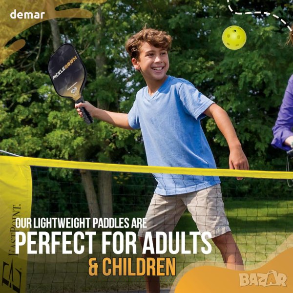 Ракетата разполага с издръжлива сърцевина от полипропилен тип пчелна пита, съчетана със здрава повърхност от въглеродни влакна, което я прави идеална както за начинаещи, така и за напреднали играчи. Ергономичната й дръжка гарантира, че можете да играете удобно, намалявайки умората на ръцете и подобрявайки контрола върху всеки изстрел. С елегантен калъф с цип, което гарантира, че вашата ракета остава защитена от прах и драскотини, когато не сте на корта. Комплект PickleBoom, с атрактивната си опаковка, е идеален подарък за всички любители на спорта.