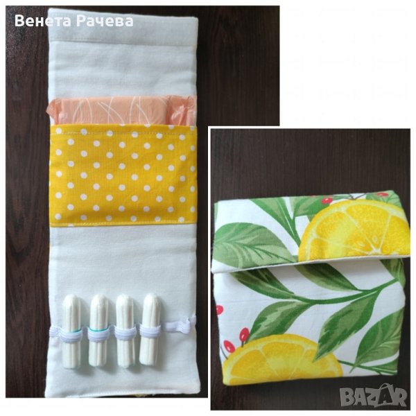 Женски органайзер за дамски превръзки и тампони. За практично и удобно съхранение на необходимите хигиенни продукти в дамската чанта или спортния сак. Изработват се по поръчка в десен по избор.