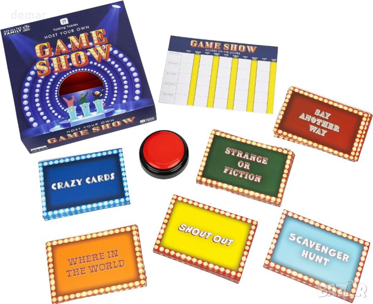 Talking Tables предлага бърза, интерактивна игра с викторина Gameshow, идеална за Коледа, Нова година или друго парти. Играе се лесно, отборите избират от карти с четири категории и могат да удвоят точките си със специални луди карти. Комплектът включва зумер, 150 карти, табло за резултати и инструкции. Идеален за възраст над 9 години, подходящ за 5 или повече играчи. Идеален подарък за всяко събиране!
