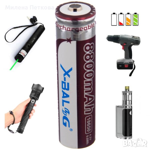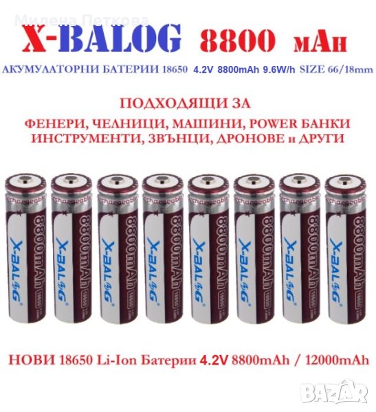 Продавам чисто нови качествени презареждаеми литиево-йонни (Li-Ion) батерии X-Balog 4.2 волта с капацитет от 8800 mAh и по-висок клас батерии RAKIETA 12000 mAh. Необходим консуматив за фенери, прожектори, челници, лампи, лазерни прицели, електрошокове, електронни устройства, машини, Power bank. Батериите са същите, като на снимките - със пъпки. Големият капацитет дава възможност за продължително ползване с едно зареждане. Време на зареждане – до 5 - 6 часа. Отлично качество на достъпна цена!