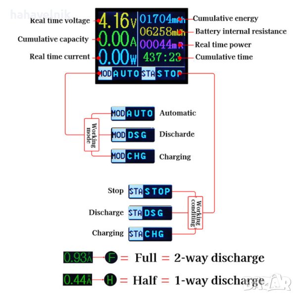 Вътрешно съпротивление на батерията: поддръжка, грешка при измерване е около 10% Показване на напрежението в реално време: поддържа се