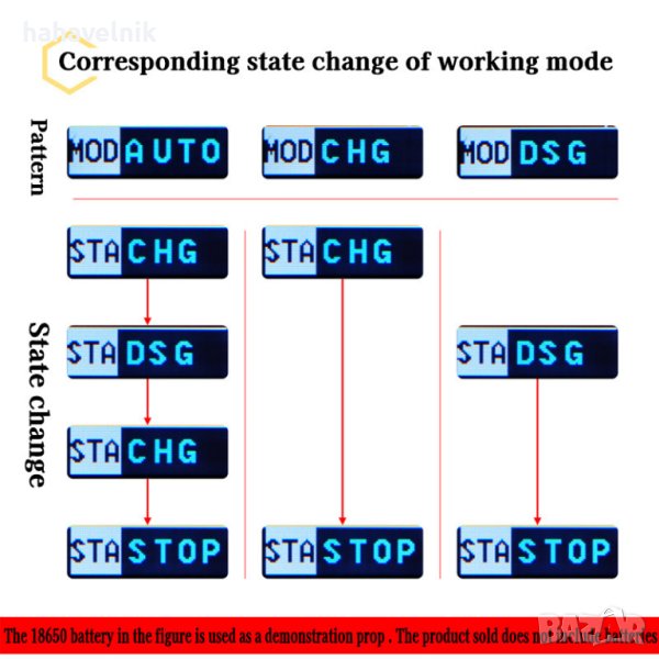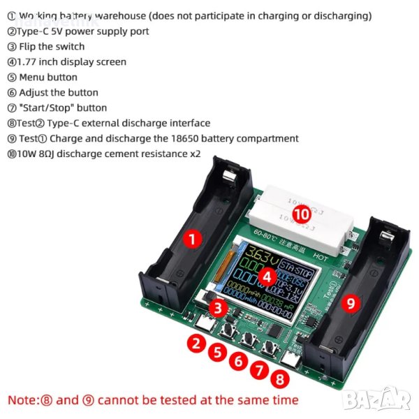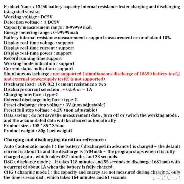 Едновременно разреждане: не се поддържа (едновременното разреждане на 18650 батерия Test① и външно тестово захранване ② не се поддържа)
