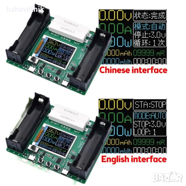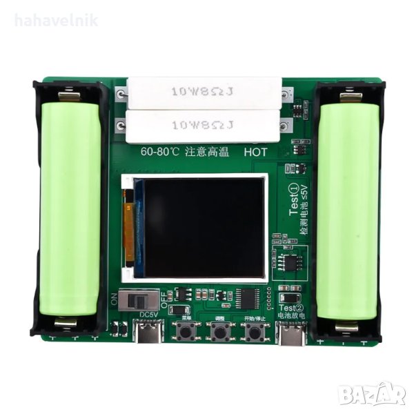 Описание: Този продукт е тестер за капацитет на батерията 18650, който се използва специално за измерване на капацитета на батерии 18650. 1,77-инчовият TFT дисплей може едновременно да показва информация като вътрешно съпротивление на батерията, капацитет, напрежение, ток, мощност и др.;