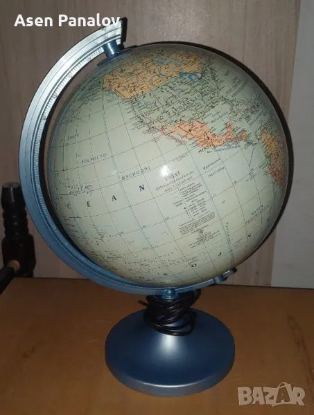 Светещ глобус на български език Размери:Конструктивна височина-33см,диаметър-20см,обиколка- 63см.Материал:пластмаса.Цена 35лв.