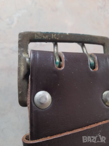 Царски офицерски кожен колан с бронзова тока с маркировка, презраменен ремък и носач за сабя автентичен. Дължина 137 см.