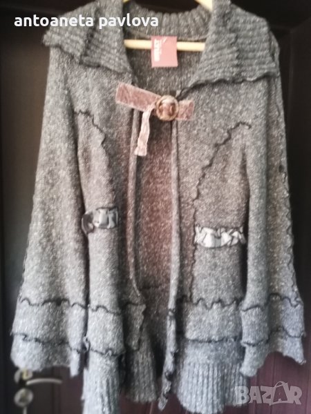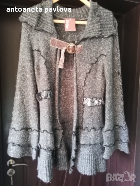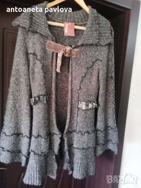 Много красива жилетка на волани в сиво-черно .Има катарама ,която е закопчаването на жилетката .С голяма яка ,разширяващсе ръкав .Мека и приятнана допир.
