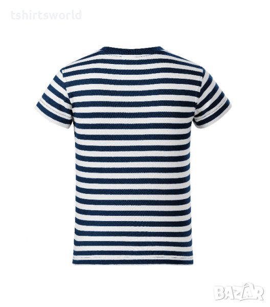 Страхотна нова детска моряшка тениска на тъмносиньо и бяло райе(navy blue) с къс ръкав, изработена от висококачествен 100% памук на 150g/m² с обло деколте. Подходяща за носене както в горещите летни дни навън, така и вкъщи пред телевизора. Материята не позволява да се измачка, което я прави изключително ценена и желана от нашите дългогодишни клиенти. Тениската може да се пере при температура до 40 градуса. Спокойно можем да гарантираме за качеството на изработката и ярките цветове на дизайна.