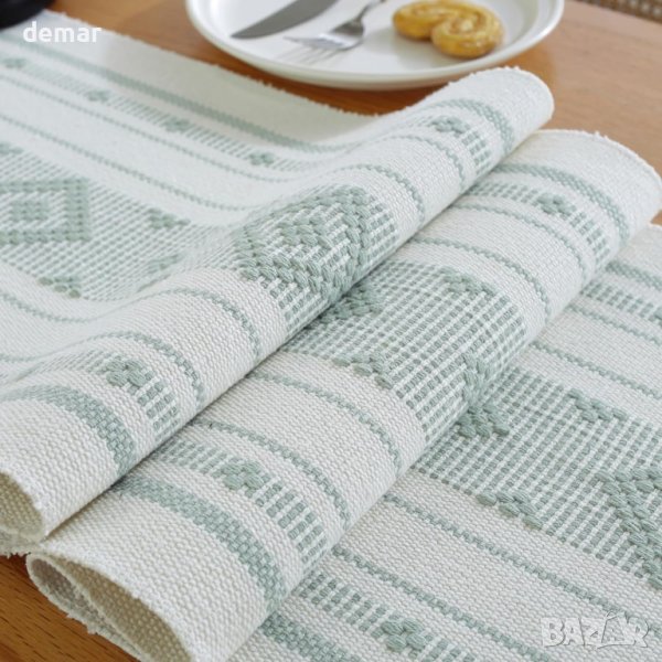 уникален зелено-бял тъкан дизайн, украсен с ръчно изработени пискюли, издига