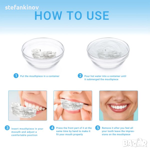 Персонализирана форма: Сварете вода и потопете назъбника за няколко секунди, докато стане гъвкав. Внимателно захапете, за да създадете персонализиран отпечатък на вашите зъби.