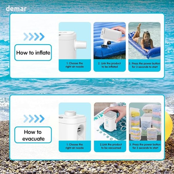 Тази електрическа въздушна помпа 2 в 1 предлага както надуване, така и засмукване, осигурявайки стабилно налягане от 4000 Pa и обем на въздуха от 200 l/min, като надува двойно въздушно легло само за 5 минути. С вградена акумулаторна литиева батерия от 2500mAh, тя може да се зарежда удобно през USB и може да работи 30 минути след 3-часово зареждане. Преносима и безжична, тази компактна помпа е перфектна за употреба както на закрито, така и на открито, като плажни излети и къмпинги. Функциите за безопасност включват защита от прегряване и издръжлив ергономичен дизайн против падане и неплъзгане. Доставя се оборудвана с четири различни дюзи, отговарящи на различни нужди от надуване, от надуваеми дюшеци до плувни халки. Ефикасна и лесна за употреба, нейната работа генерира под 80 децибела шум, осигурявайки минимални смущения по време на употреба.
