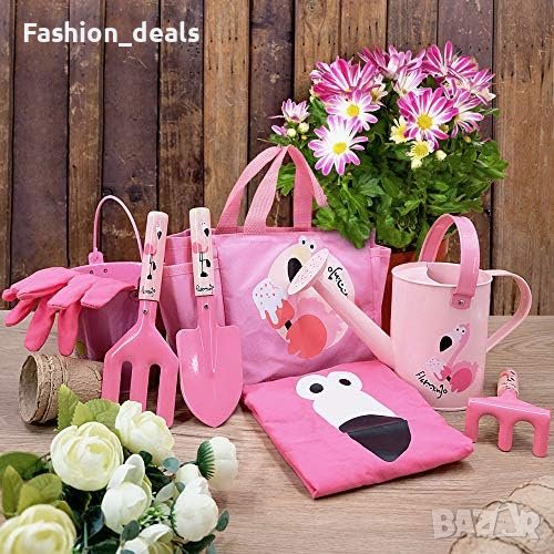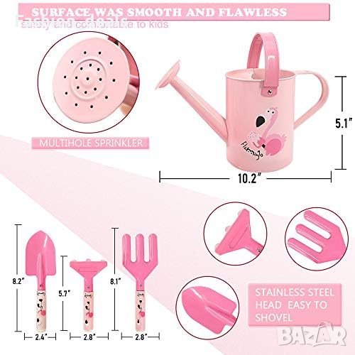 Розовите детски градински инструменти са изработени от лек метал и удобна дървена дръжка. Чантата е изработена от оксфордски плат, а детските ръкавици - от чист памук, а тази зелена лейка е от здрав метал с екологична обработка с прахово покритие против ръжда.