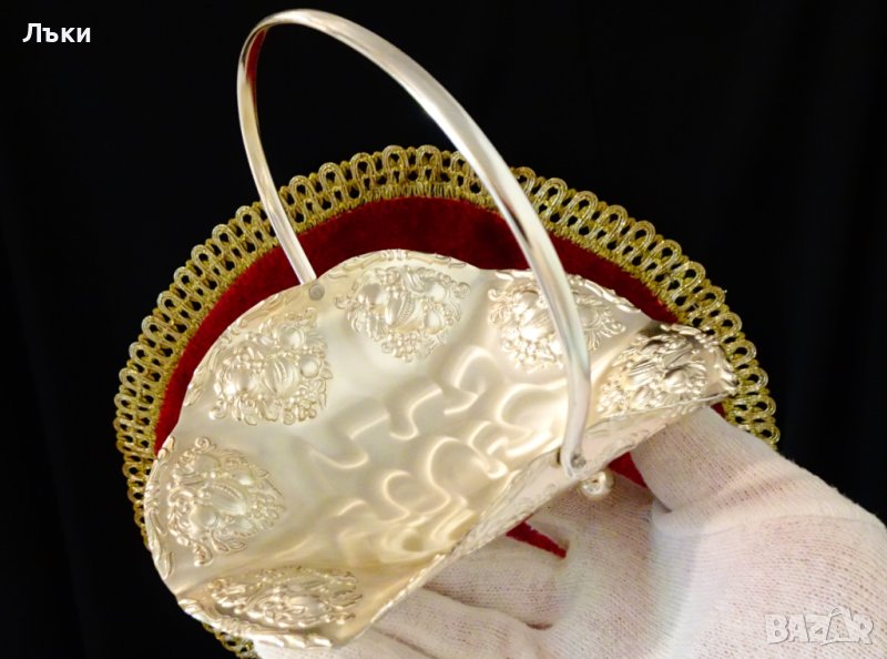 ръчна изработка от месинг,дебело посребрена с висока проба сребро.Има дизайн на кошница с извита дръжка,три стабилни крачета топчета и вълшебно красива релефна
