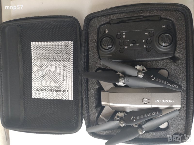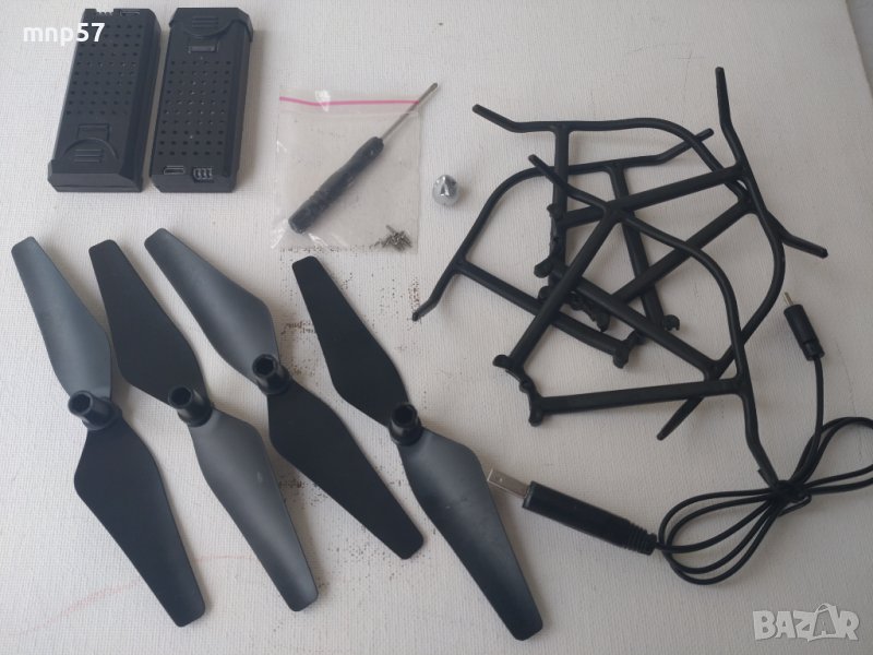 1 бр.дрон,1бр.дистанционно,2 бр.батерии,4 бр.резервни витла,1 бр.рез.държач за витло,4 бр.предпазители на витлата,1 бр.отвертка и упътване на английски ез.Чанта.