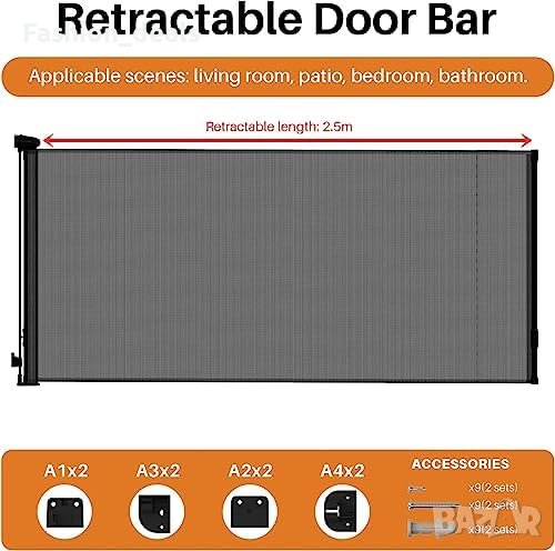 Подходяща за отвори с ширина до 250 см и е висока 83 см. може да се регулира, за да пасне на отворите според вашите нужди. Мрежата може да бъде напълно прибрана, когато не се използва.