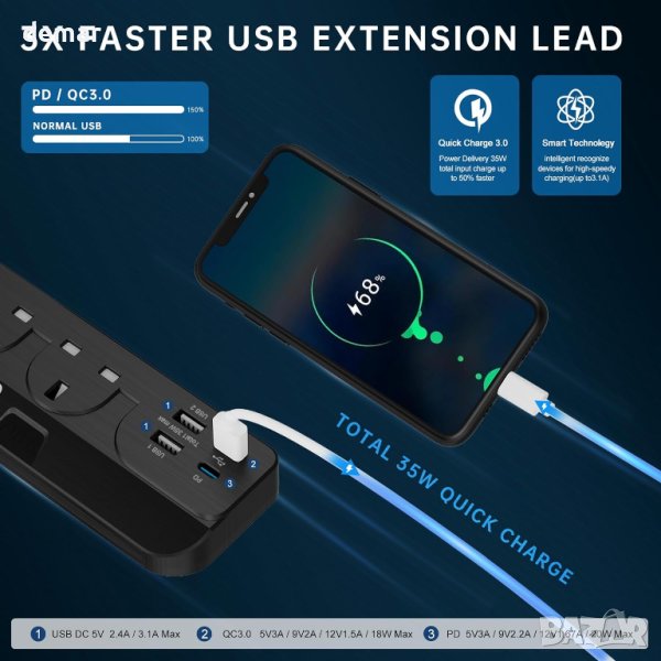 Удължителен кабел с USB слотове, 2 изхода, 4 USB(PD+QC3.0) – 3 м